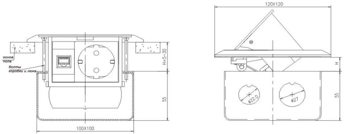 Люк в пол на 3 модуля 22.5x45мм (1 модуль 45х45мм + 1 модуль 12,5х45мм), латунь
