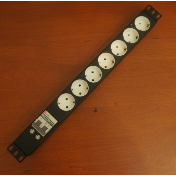 Блок электрических розеток 19" 7 гнезд, с автоматом 2P 16A со шнуром питания, железный корпус с заземлением