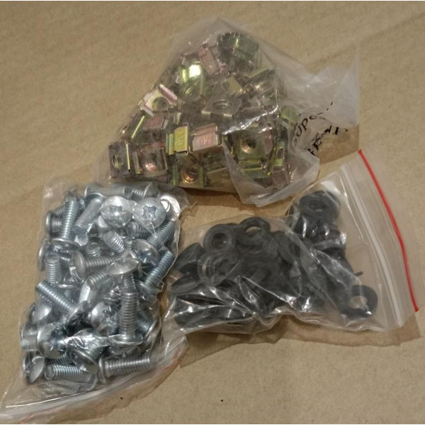 Монтажный комплект ЦМО КМ-2-50 для установки оборудования в телекоммуникационном шкафу или серверной стойке состоит из пятидесяти винтов М6×16, пятидесяти клетьевых гаек с защелкой М6 и пятидесяти металлических шайб М6. Вес — 400 г.